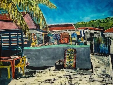 A trip to the East African nation of Uganda in high school lead Muffy Clark Gill to an interest in the ancient art of wax and dye resist painting known as batik and later the Japanese wax process known as rozome. Her main source of inspiration is based on her memories of life and travel.